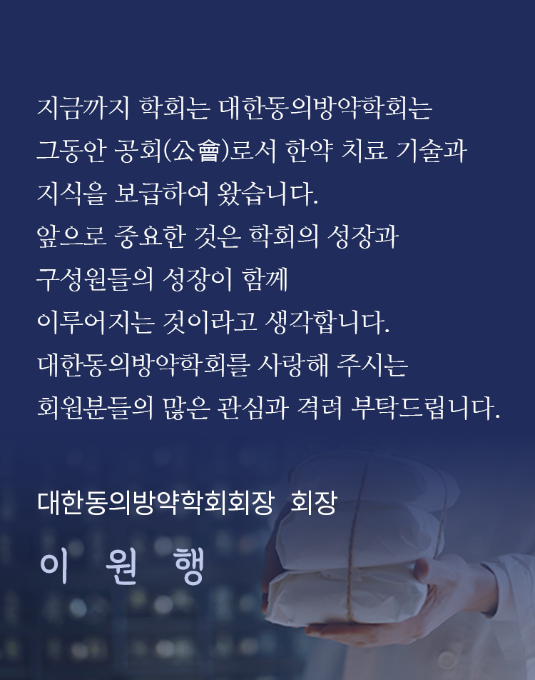 대한동의방약학회 회원 여러분 반갑습니다. 2023년 출범한 3기 회장 이원행입니다.